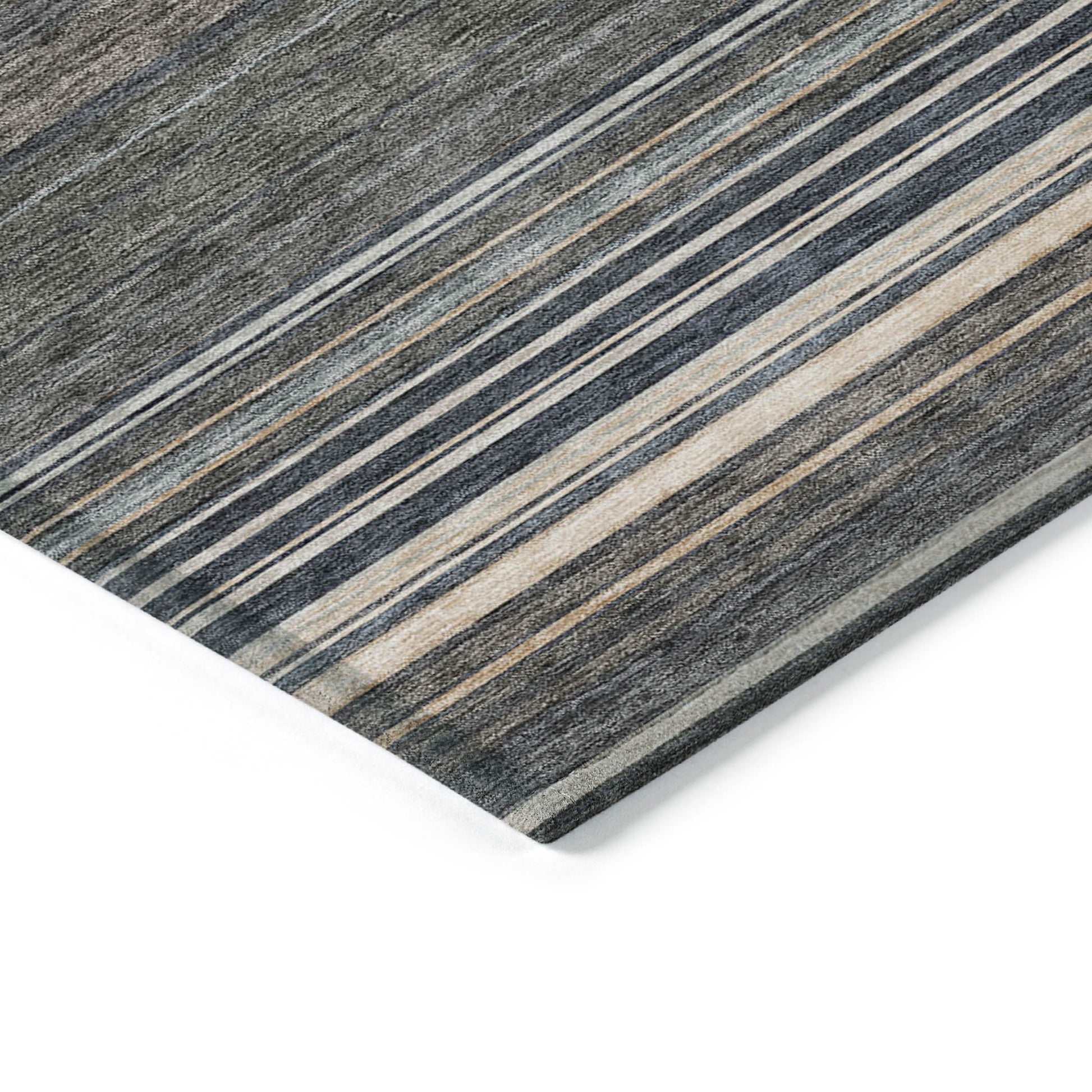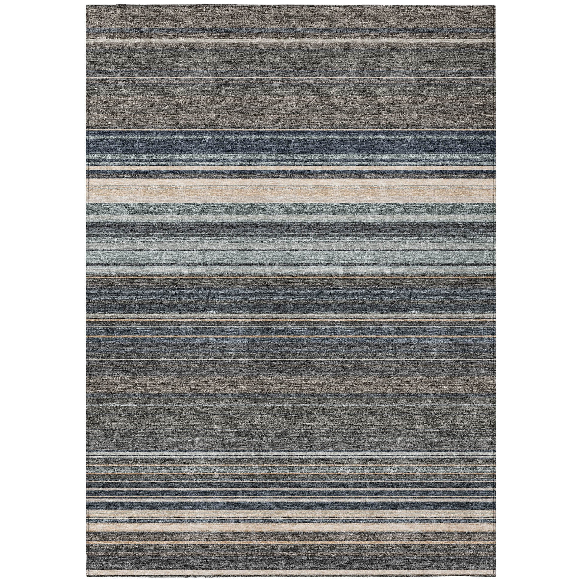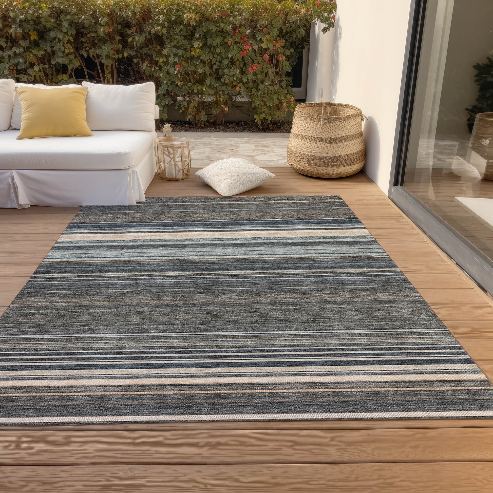 Set an inviting tone in your space with this 9-foot x 12-foot taupe beige and pewter striped washable indoor outdoor area rug. This rectangle shaped rug features a striped design that will work well both indoors or out. A classic shape marries with good looking design for your living room, hall, bedroom, porch, patio, or poolside. Ideal for outdoor spaces or high traffic areas with kids and pets, this rug is made from heavy duty polyester that is stain resistant to help repel water, dirt, and stains. Versatile in use, durable, and easy to maintain, this rug is an ideal solution to add a decorative and inviting touch to your indoor or outdoor space. 108-inch h x 144-inch w x 0.19-inch d.